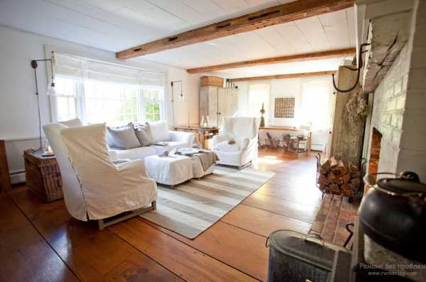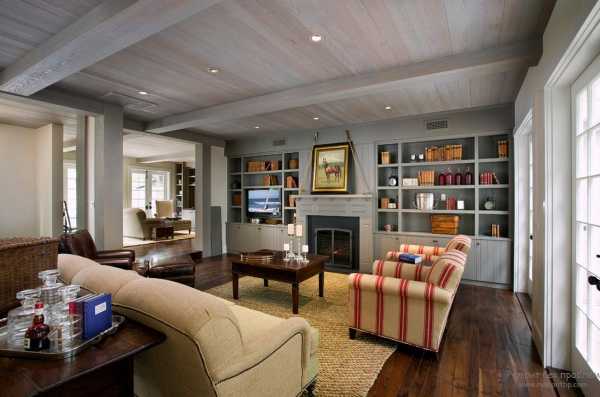 Простое и комфортное решение внутренней отделки дома своими руками. Интерьер радует спокойствием пастельных красок и добротностью деревянной мебели. Последняя должна быть либо раритетной, либо патинированной. В гостиную надо поставить диван с рюшевой оторочкой и деревянными, округлой формы, подлокотниками. В комплект к нему могут быть добавлены аналогичного вида кресла.
