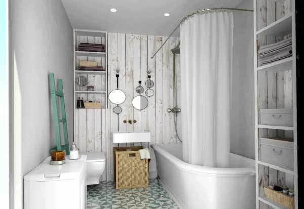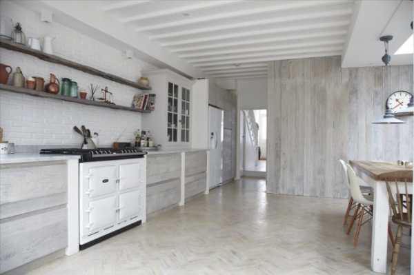 Белая стена из окрашенной и искусственно состаренной вагонки хорошо вписывается в интерьер ванной комнаты в скандинавском стиле (хотя на наш взгляд, в ванной это не совсем удобно)…