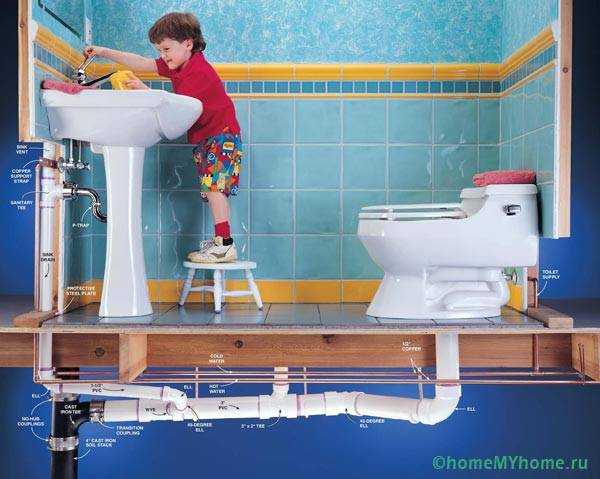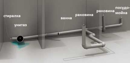 Целесообразно объединить в один стояк кухню и ванную комнату. Для подключения всех точек сброса воды, кроме туалета, используется труба сечением 50 мм. Для туалета – 110 мм.