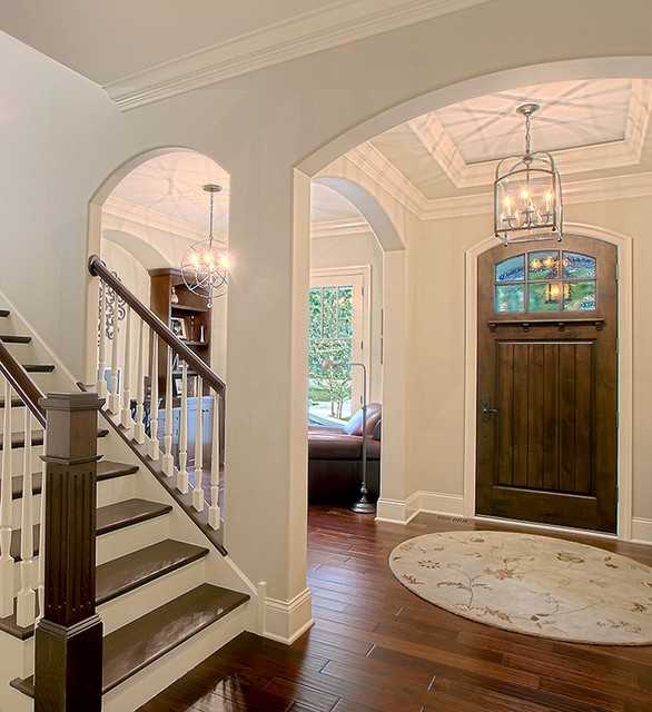 Подбирая интерьер для входа необходимо учитывать формы, цвет и детали дома, чтобы они были взаимосвязаны с его внешним видом и архитектурой, и были единым целым. Окраску входного навеса следует выполнять согласно общему цветовому решению дома. По оформлению можно определить желание владельца придать своему жилищу определенный характер, подчеркнуть его солидность или может показать экстравагантность, или наоборот холодность и деловитость.