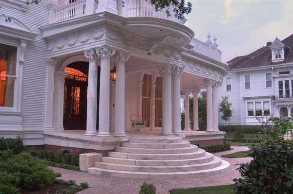 Импозантно, особенно в сочетании с кладкой из камня, в отделке входной группы коттеджа будут смотреться перила из кованного чугуна, витражные окна. Особенно, — если фундамент веранды выполнен в форме ротонды: это сразу придаст строению сходство со рыцарским замком.