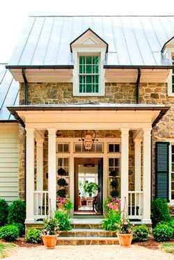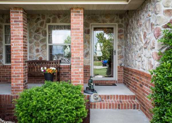 С кирпичным или блочным домом используется каменное крыльцо. Облицевать его можно искусственным камнем, плиткой, которыми украшен коттедж, или придумать что-то сочетающееся с общим дизайном. Каменное строение – пожаробезопасно, выглядит оно солидно и требует вложений. Также и входная группа в частный каменный дом заставит хозяина потратиться. Прочный армированный бетон в основе лестничного подъема, облицовка из тротуарной плитки. Все напольные элементы должны выдерживать вес человека, мороз, ливневую нагрузку. Козырек над дверью можно сделать из кованых металлических деталей, подражая общему солидному виду.