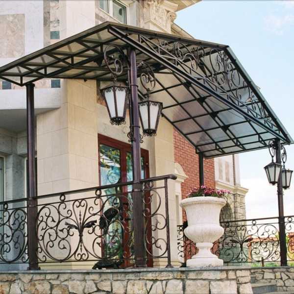 - Навес. Этот элемент необходим, если вы хотите сделать входную группу максимально комфортной. Он не только защитит как дождя, снега и солнца, но и придаст внешнему виду логическую завершенность.