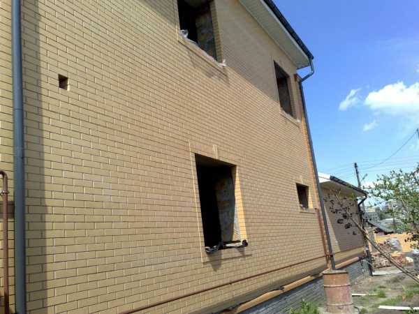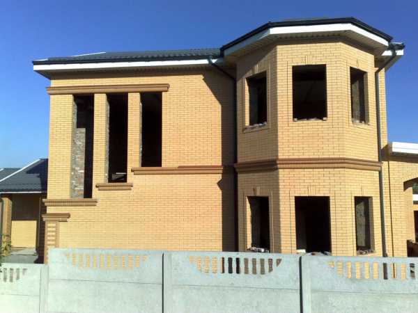 Стены – лицевой кирпич клин – керам (керамейя), эконом класс, желтого цвета, на сегодняшний день один из лучших материалов. Пилястры, карнизы и колонны – керамейя на два тона темнее, чем стены дома, фигурный (круглый угол) кирпич.
