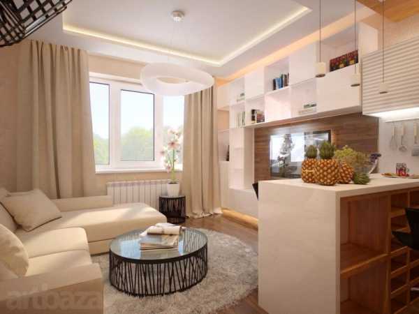 Светлый дизайн в квартиреУже считается не современным, расположение мебели по периметру стен. Дизайнеры ищут интересные идеи в виде зонирования на две зоны: отдыха и рабочей. Чтобы не перегрузить комнату используют прозрачные или полупрозрачные перегородки из стекла или сквозные из гипсокартона, пропускающие свет.