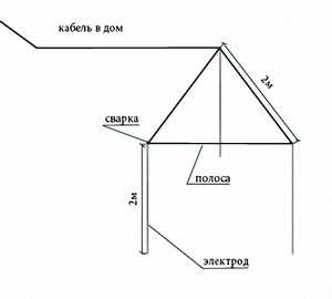 6. Уложить в траншею треугольник из уголков и соединить его вершины с вбитыми элементами с помощью сварки. Металл обрабатывается только токопроводящей смазкой. Красить и грунтовать его нельзя, так как покрытие может повлиять на функциональность устройства.7. От ближайшей вершины контура провести к дому вдоль траншеи стальную полоску. Соединить её сваркой с контуром.