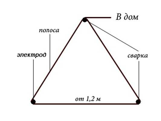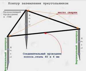 На практике наиболее популярна схема выполнения заземляющего контура в виде треугольника, хотя возможны любые другие варианты его геометрии. Три штыря одинаковой длины забивают в грунт в углах равностороннего треугольника и соединяют их горизонтальной шиной.