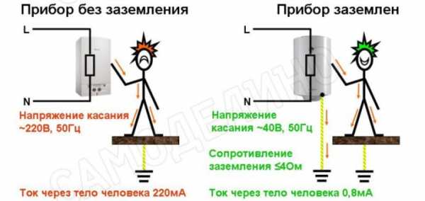 , тем сильнее будет ощущаться воздействие тока на организм.Если присутствует заземление, ток с повреждённого устройства потечёт на землю по нему. Если в этом случае человек касается корпуса прибора, то его тело становится параллельно подключённым к заземляющему проводнику. Сопротивление последнего намного меньше сопротивления тела, поэтому большая часть тока будет течь по пути наименьшего сопротивления, а человек максимум ощутит лёгкое пощипывание и избежит получения тяжёлых электротравм.
