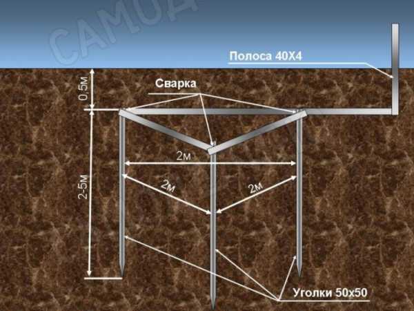 Размеры контура заземления в виде треугольникаЕго следует измерить по мере готовности конструкции.Стальной профиль длиной 3-5м обрезают болгаркой под углом для облегчения забивания в грунт. Отметим, что для уменьшения сопротивления растекания тока следует выбрать максимально длинные стержни, которые удастся загнать в землю. В любом случае они должны заходить ниже глубины промерзания не менее, чем на 1м. Для облегчения работы можно предварительно пробурить отверстия в земле на длину бура.