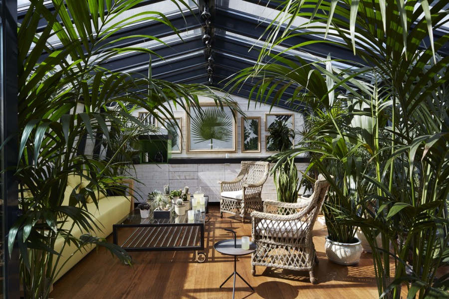 Это уникальное убежище, наполненное элегантным подвесным освещением, висящими растениями и вьющимися лозами, может оставаться открытым небу в погожий день, а датчики дождя и автоматически раздвижная крыша обеспечивают его защиту от непогоды. Агент дома Джейк Рассел описывает его как «автомобиль с откидным верхом».