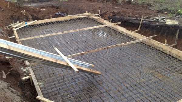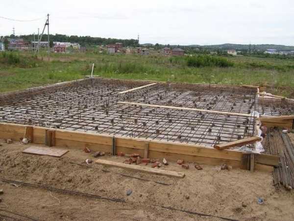 Для армирования фундамента понадобятся металлические прутки диаметром 16 мм, которые укладываются крестообразно в два ряда: верхний и нижний. Расстояние от поверхности должно составлять около 5 см. Шаг между прутками оставляют около 20 см.
