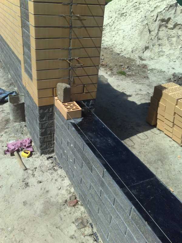 На стыках цоколя с фундаментом и со стеной укладывается водонепроницаемый рулонный материал. Таким образом, влага перекрывается двумя барьерами: между фундаментом, цоколем и стеной. Его укладывают в два слоя и закрепляют битумным раствором для того, чтобы потом было проще строить стены.