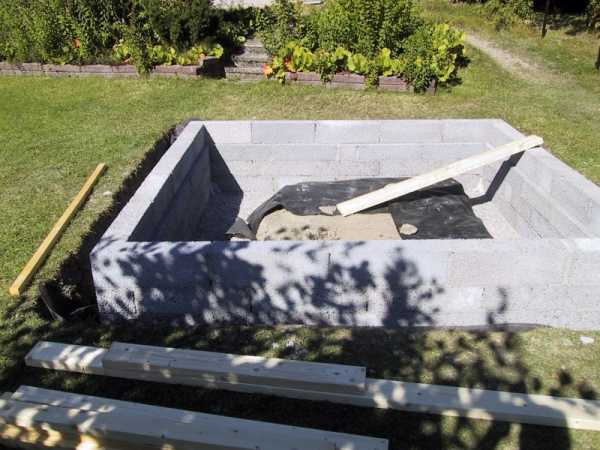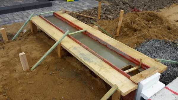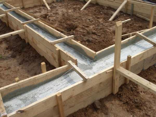 Следующим шагом станет укладка гидроизоляционного материала, и заливка цементным раствором. После необходимо сформировать опалубку, она создается из струганных досок. Опалубка тщательно фиксируется по периметру стен траншей, это предотвратит их вспучивание.