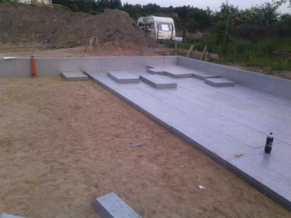 Для его монтажа роется котлован, глубина зависит высоты фундамента (30-50 см.) с учетом подушки около 10-15 см и в добавок пенопласт или другой вид теплоизоляции. Дальше ровняем основу ямы, засыпаем песком, трамбуем.