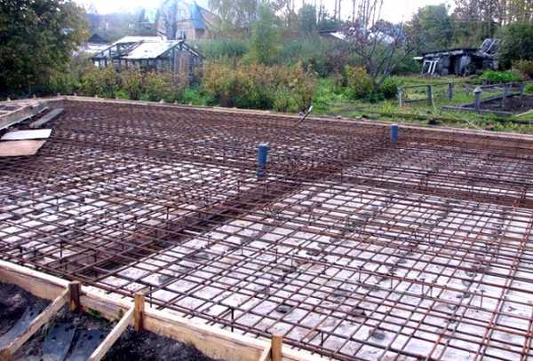 10. Армирование – перевязка железных прутьев с минимальным сечением в 12 мм с помощью пластиковых хомутов или проволоки с интервалом от 20 до 30 см. Сетка размещается в два слоя, нижний связывается из более толстой и прочной арматуры. На этом этапе важно не повредить утеплитель (при наличии) или гидроизоляцию, поэтому под прутья размещают специальные пластиковые подпорки.