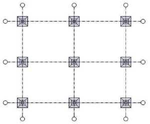 Столбы при возведении столбчатых фундаментов устанавливаются под углами наружных стен строения, а также под пересечениями наружных стен с внутренними и внутренних – между собой. Столбы ставятся с определенным размером шага (1,2–2,5 м – в зависимости от нагрузки на фундамент) по всему периметру здания, а сверху укладываются обвязочные балки. При расстоянии более 2,5–3 м между стоящими отдельно столбчатыми фундаментами поверху нужно обязательно укладывать либо массивные металлические, либо железобетонные рандбалки.