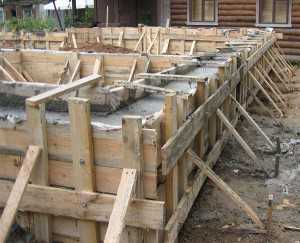 При заливке фундамента опалубку может распереть, поэтому лучше сразу ее укрепить наружными подпорками или стянуть проволокой.