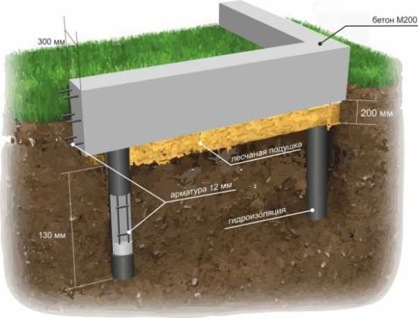 При сооружении своими руками свайно ленточного фундамента, чаще всего, используют мелкозаглубленный вид ленты. В этом случае монолитная железобетонная лента заглубляется в грунт на глубину 20-40 см и опирается на песчано-гравийную подушку высотой 20-30 см и буронабивные (заливные) армированные сваи круглого сечения.