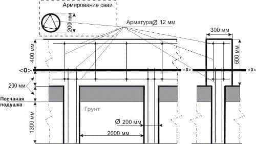 Самый распространенный вариант — мелкозаглубленная лента, Глубина заложения ленты составляет от двадцати до сорока сантиметров. При этом сваи используют буронабивные, с круглым сечением и дополнительным армированием. Лента, в таком случае, опирается на подушку, выполненную из песка и гравия, высота которой составляет около двадцати сантиметров.