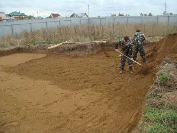 - затем производится послойная отсыпка песком на толщину 10-15 см. Каждый слой проливается водой, тщательно выравнивается по горизонтали и утрамбовывается;