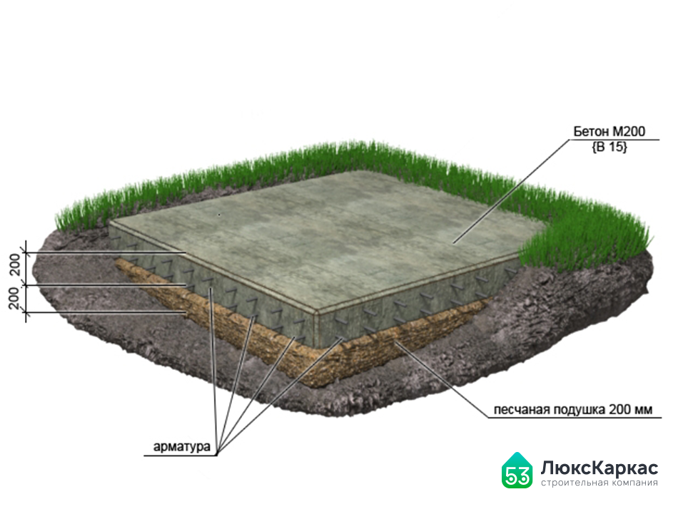 Это часто достигается за счет различной степени модификации и укрепления грунтового основания. Сколько делается, зависит от типа грунтов на участке и расчетных нагрузок на плиту. Основной материал вскрывается и уплотняется, а на него насыпаются и уплотняются слои карьерной насыпи и гравийного щебня. Затем поверх этого основания заливается железобетонная плита. Пол и фундамент заливаются одновременно.