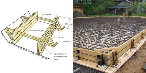 Изготавливают опалубочные щиты из обрезных досок, влагостойкой фанеры, ОСП, плоского шифера. С наружной стороны будущей плиты опалубку обязательно фиксируют распорками, которые опираются во вбитые в грунт обрезки досок. Монтируют щиты непосредственно на месте строительства плитного фундамента или используют готовые. Монтаж, например, столбчатого фундамента в опалубке не нуждается.