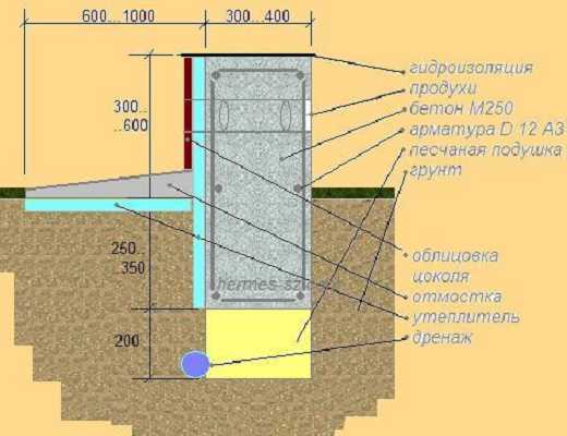 - Высота заливки над уровнем земли должна быть 20–40 см. Зависит она от уровня залегания ГВ и материала из которого собирают стены, так для бани из бруса высота цоколя должна быть больше, так как дерево не любит влагу.