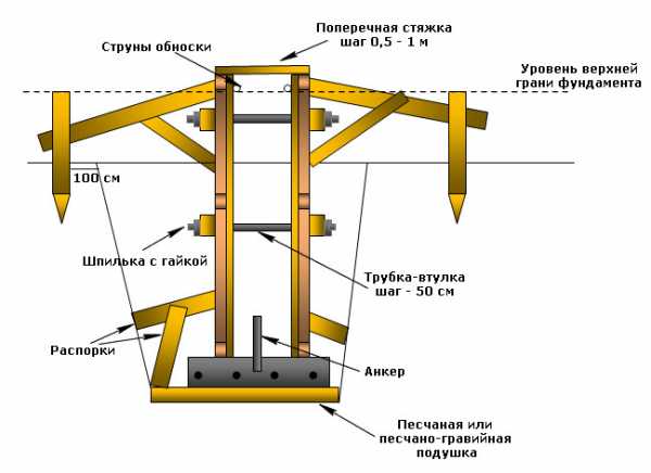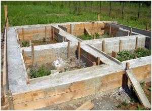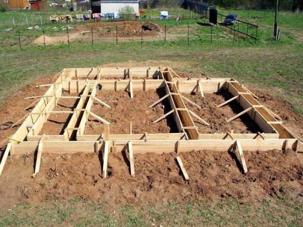 Следующий шаг – монтаж опалубки для бетонной заливки. Опалубка изготавливается из деревянных щитов, фанеры, плоского шифера, металлических листов и т.д. Важно, чтобы её внутреннее пространство создавала точный объем для формования бетонной массы требуемой формы и размера. При ленточном типе основания опалубка представляет собой две параллельные стенки, расстояние между которыми строго соответствует ширине бетонной ленты. С внешней и внутренней стороны стенки опалубки укрепляются распорками и подпорками для предотвращения их смещения при заливке.
