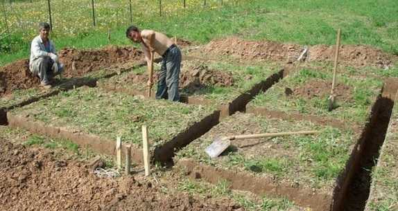 У участка должен быть небольшой уклон в любую сторону, за исключением северной. Это позволяет защитить постройку во время весеннего таяния снега. Сначала грунт выравнивают и снимают с него верхний слой. Затем проводят разметку. Учтите, что она должна превышать ширину стены на 10-15 см.