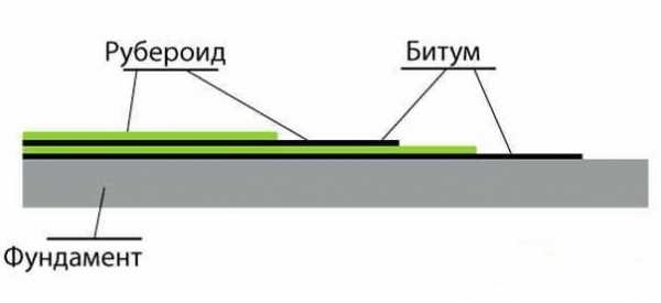 - Застилается гидроизоляция, например, рубероид. Слоёв может быть 2–3, главное, чтобы не было незакрытых участков, внахлёст 10–15 см.
