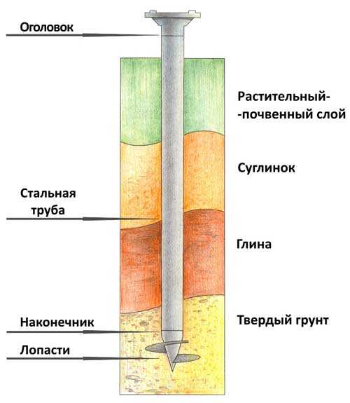 Потому что в основе технологии сооружения этой конструкции лежит свая из металлической трубы, на конце которой есть бур с лопастями. Так вот этот бур вкручивается до тех пор, пока под ним не образуется прочная и надежная подушка из спрессованного грунта.
