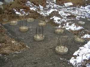 Исходя из того, что даже сваи не самого большого диаметра имеют достаточную несущую способность, оптимальным считается их установка по периметру строения, под несущими стенами и на их стыках на расстоянии 2-3 м. Также следует определить глубину их установки исходя из такого параметра, как промерзание почвы в зимний период.