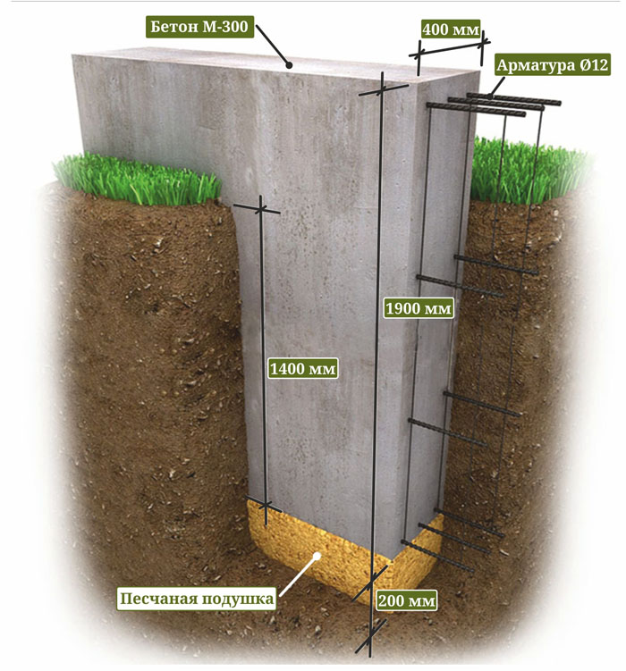 | Монолитный для забора шириной 25 см, высотой 40 и заглублением на 20 | Земляные работы, засыпка и трамбовка по 10 см песка и щебня, двухрядное армирование и заливка бетона, установка и демонтаж опалубки | От 2700 |