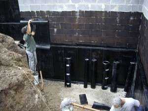 Вертикальная гидроизоляция выполняется путем нанесения защитного слоя на всю высоту фундамента на его вертикальные стенки.