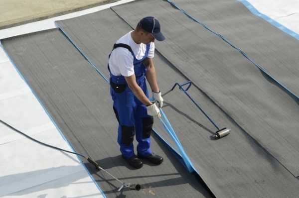 - Далее укладывается изоляционный материал: оклеечный укладывается в несколько слоев, а стыки промазываются мастикой, а наплавляемый наплавляется в один слой газовой горелкой.