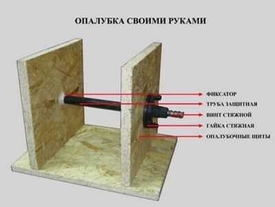 На щитах размечают и сверлят отверстия диаметром 8-12 мм. В отверстия вставляют резьбовые шпильки, длина которых превышает ширину опалубки. На выступающие края детали надевают крупные металлические шайбы и накручивают гайки.