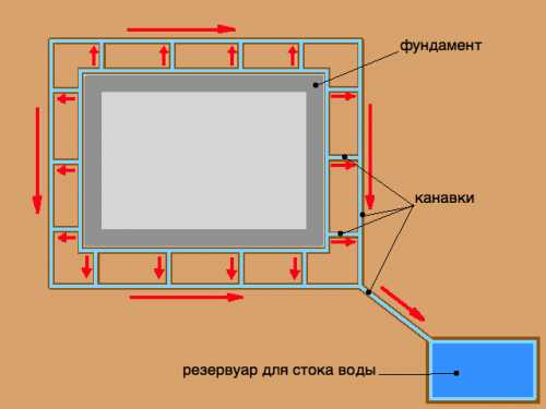 По периметру заложенного фундамента прорывают неглубокий обводной канал глубиной 30-40 см в направлении имеющегося естественного уклона, чтобы скапливающаяся вода могла перемещаться самотеком. Если такого уклона нет, его необходимо будет предусмотреть при прокладке дренажной траншеи, ведущей в вырытый резервуар для отведенных вод. Для нормального функционирования дренажа, дно приемной ямы должно располагаться ниже уровня обводной стока на полметра.