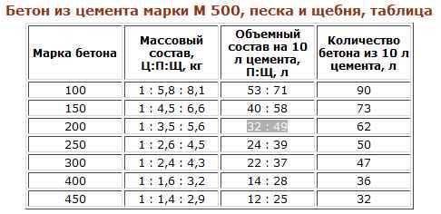 Чтобы изготовить бетон для фундамента той или иной марки, нужно знать в каких пропорциях смешивать цемент, песок и щебень. Ниже приведены 2 таблицы, в которых указаны пропорции составляющих для замеса бетона в зависимости от используемой марки цемента.