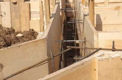 Для обустройства основания роется траншея, ограниченная линиями внутреннего и внешнего периметров. Грунт в траншее тщательно утрамбовывают. Глубину заложения выбирают с учетом особенностей климата в регионе и высотности сооружения. Определяющее значение для выбора имеют проектные стеновые материалы и типы перекрытий.