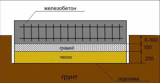 Схема укладки основания. Здесь подробно показан «пирог», из которого состоит фундамент.