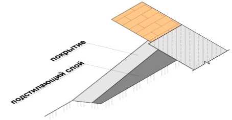 Рассматриваемая конструкция состоит из покрывающего (верхнего) и подстилающего (нижнего) слоев. За счет подстилающего слоя обеспечивается ровность поверхности. Однако основание должно быть не на 100% горизонтальным, а иметь некоторый уклон.