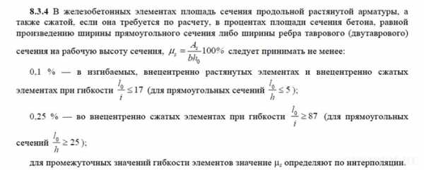 Расчёт арматуры для ленточного фундамента дома подразумевает использование основного нормативного документа – СНиП 52-01-2003, в котором указано, что содержание продольной арматуры в железобетонном элементе должно составить не менее 0.1%. Т.е. совокупная площадь сечения прутьев арматуры должна быть не менее 0.1% от рабочей площади поперечного сечения железобетонного элемента.