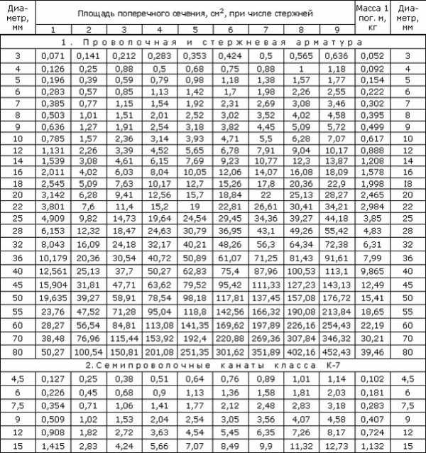 Сверху указано количество стержней. Основное тело таблицы – площадь поперечного сечения арматуры (0.1% от площади поперечного сечения ленты фундамента). Совместив количество стержней и параметр площади сечения, в правой колонке узнаём необходимое сечение арматуры.