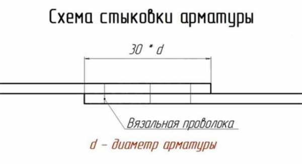 Обозначения на схеме указывают на то, что нахлёст продольных прутьев должен составлять не менее 30 их диаметров. Например, диаметр одного прута составляет 8 мм, это значит, что нахлёст арматуры необходимо делать не менее чем 24 см.