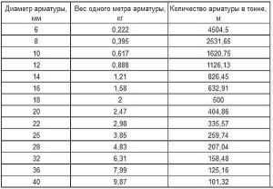 Узнав диаметр арматуры или её сечение, данные необходимо подставить в таблицу, которая покажет не только вес одного метра материала, но и метраж в одной тонне, что очень удобно при расчётах общего количества.
