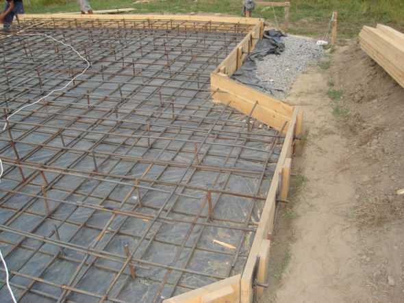 В полученную траншею устанавливается опалубка, ребра жесткости армируются по тому же принципу, что и монолитная плита. Обустраивается двухслойный арматурный каркас с выводом вверх арматурных прутьев по всей частоте вязки.