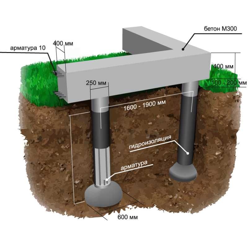 Пробурили одну скважину — и сразу бетонируем. Эту процедуру следует выполнять на песчаных грунтах и при повышенном уровне грунтовых вод. - При наличии на участке неровного рельефа ростверк необходимо выполнять либо с переменной высотой сечения для малых уклонов, либо ступенчатым для больших уклонов.