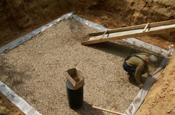Вниз котлована насыпьте не менее 50 см гравия, все тщательно утрамбуйте. Если почва достаточно рыхлая, дополнительно добавьте речной песок, перемешанный с мелким щебнем. Все вновь тщательно утрамбуйте.