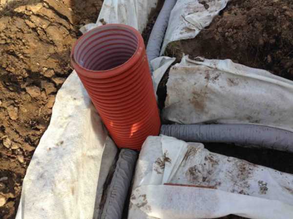 Убедившись в том, что все сделано правильно, закрывают систему. Трубы заворачивают геотекстилем, он убережет систему от заиливания, не препятствуя попаданию внутрь воды. В результате получится пластиковая труба, завернутая в подушку из щебня и ткани.