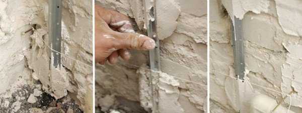 - На расстоянии 1,5 м друг от друга на высоту фундамента к стенам крепятся маяки.